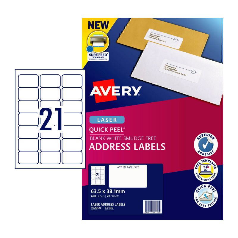 Avery Laser Label Quick Peel L7160 63.5x38.1mm 21Up Pk20 allow you to Get mail out the door quickly. Print professional-looking Jam Free labels from your laser printer. Then peel and apply in no time using the unique Quick Peel Pop-up Edge.