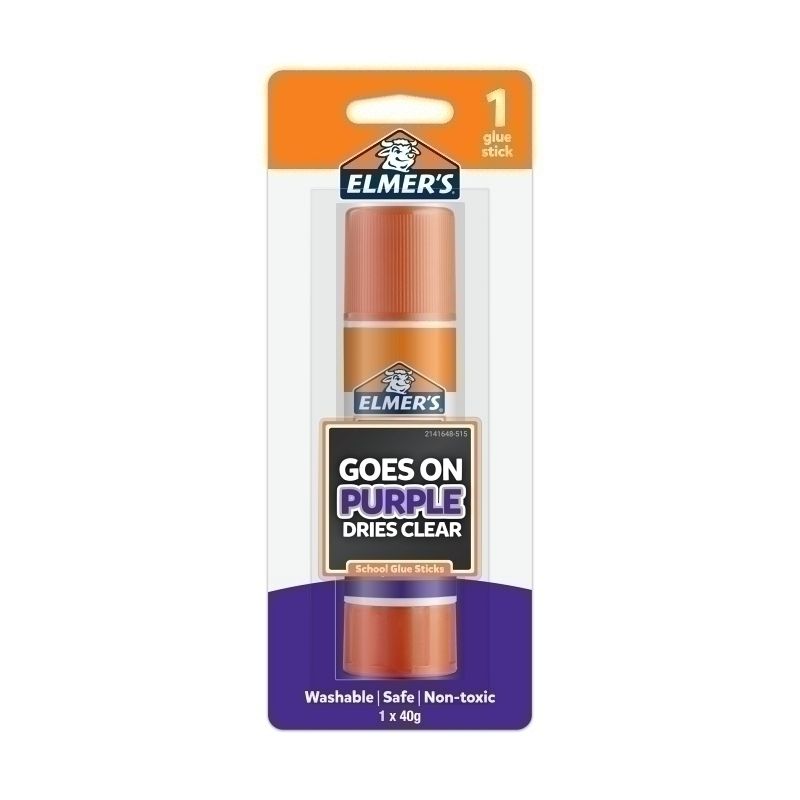 Elmers Purple Disappearing Glue Sticks 50g Bx6 is easy to see when applying, but dries fast and colourless. Washes easily off hands and out of clothes. CLEAN-UP: Wipe excess with a damp cloth. If necessary, soap and water may be used.